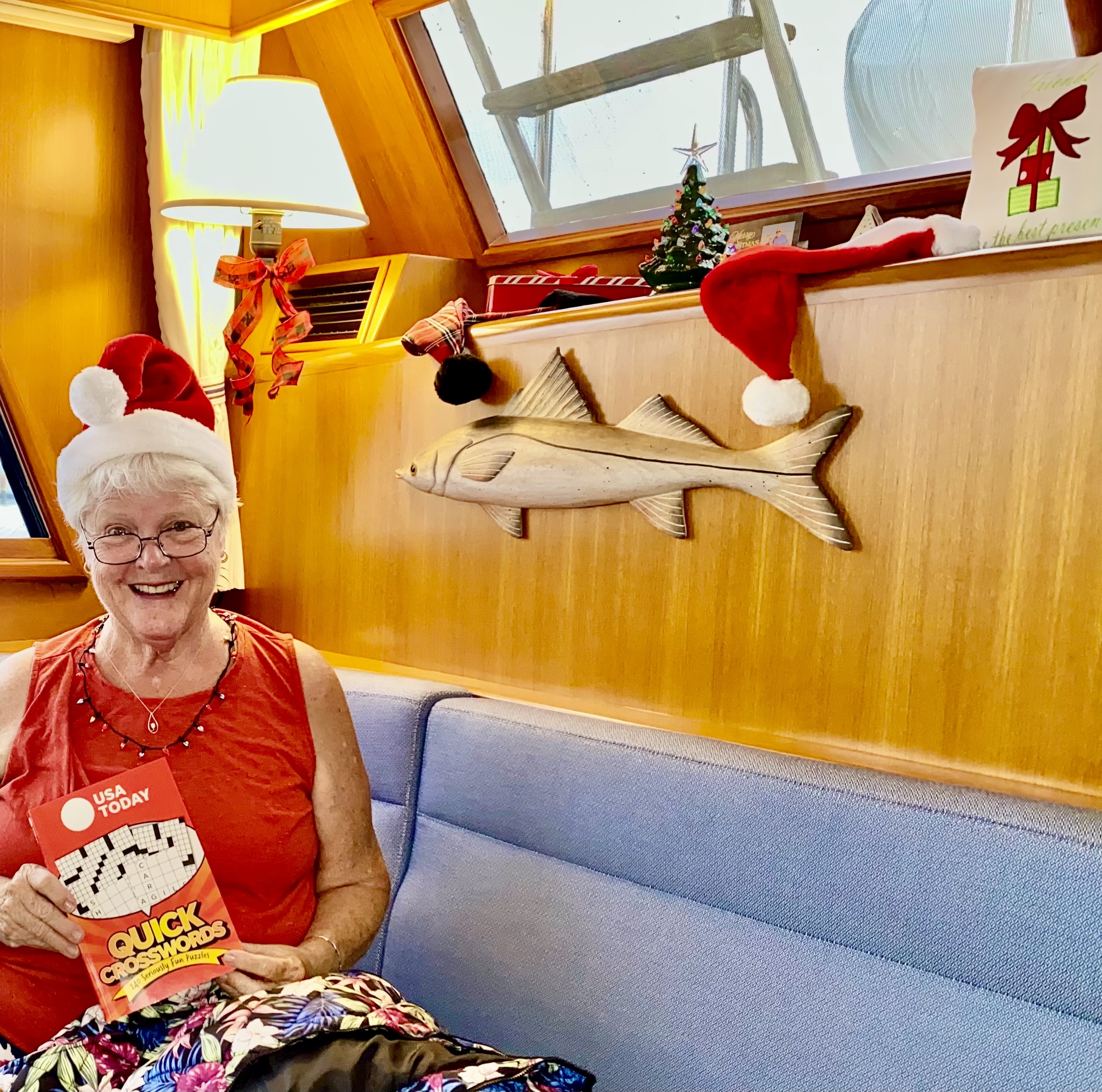 Longboat Key, FL. December 29, 2024. We hope everyone had a very Merry Christmas. We had a most enjoyable Christmas Day with the afternoon through early evening spent with three other couples on Tom and Doris’s boat (Our Time). We gathered at 1 PM for snacks and drinks and at 2:30 PM we all had Christmas dinner. Like last year when we hosted on 2thFISH, we all ordered meals from a local restaurant, heated them on our respective boats and then carried them to Our Time. Christmas day started out foggy but within about three hours the fog burned off and it was a beautiful, warm day.