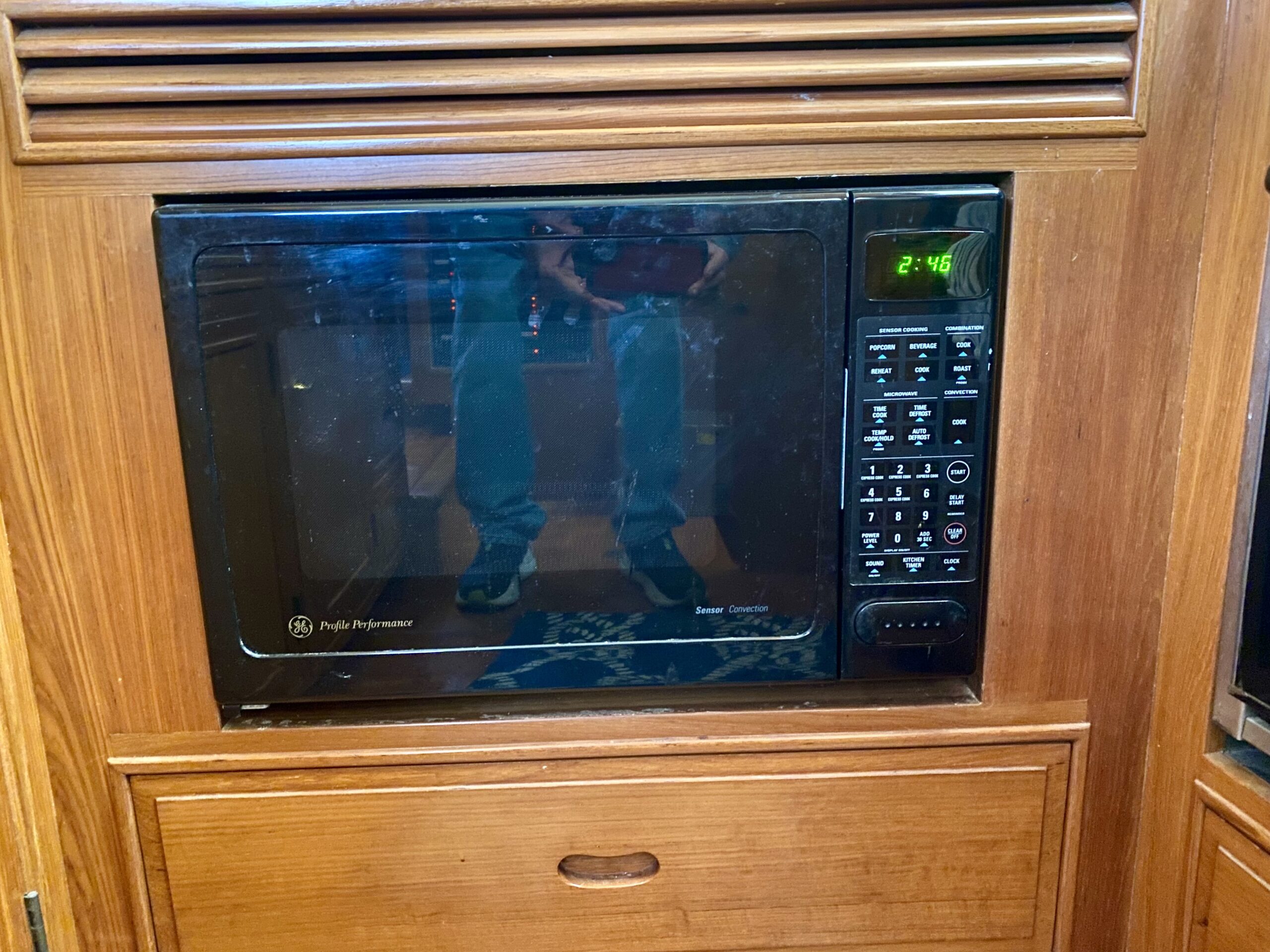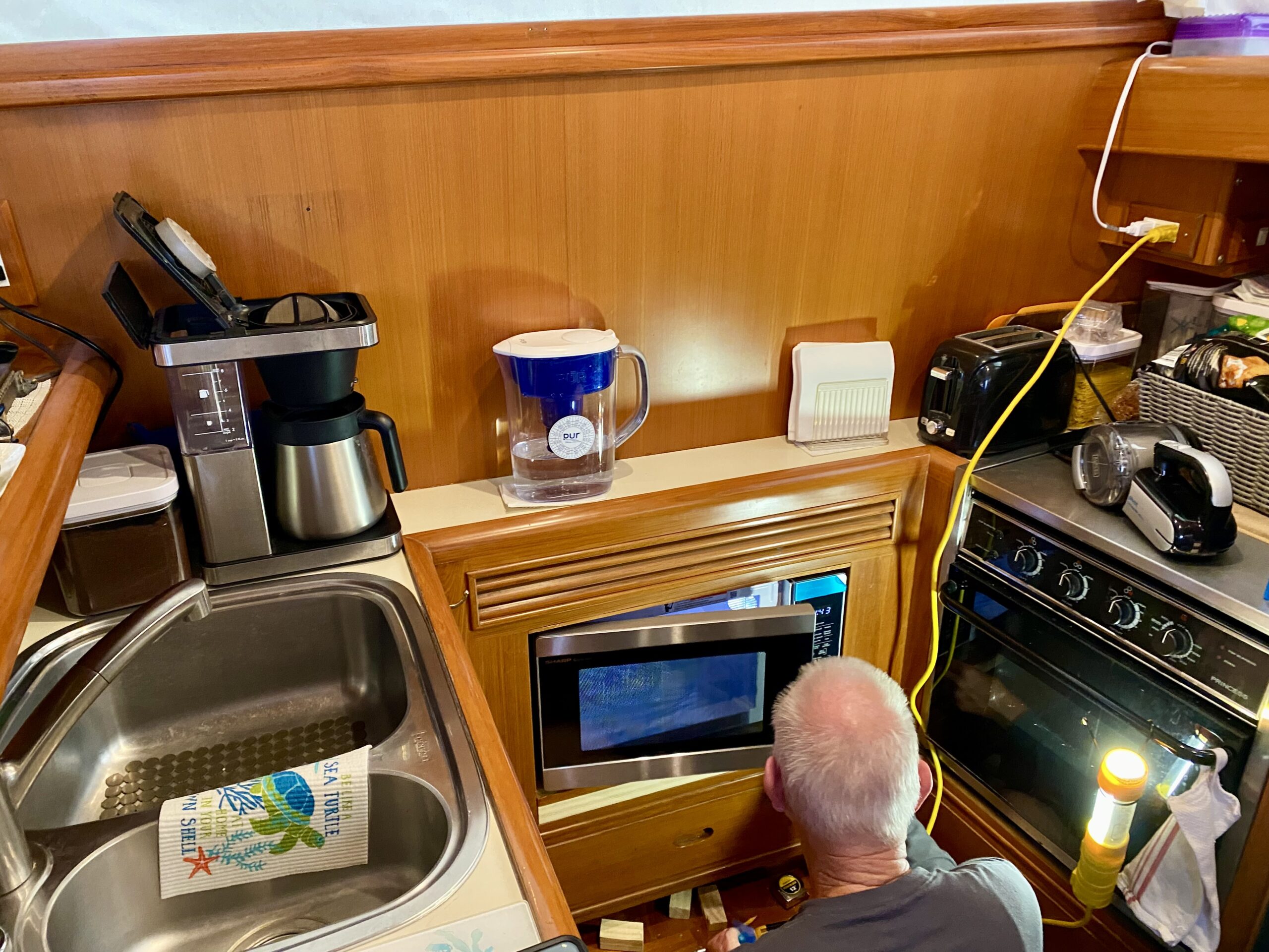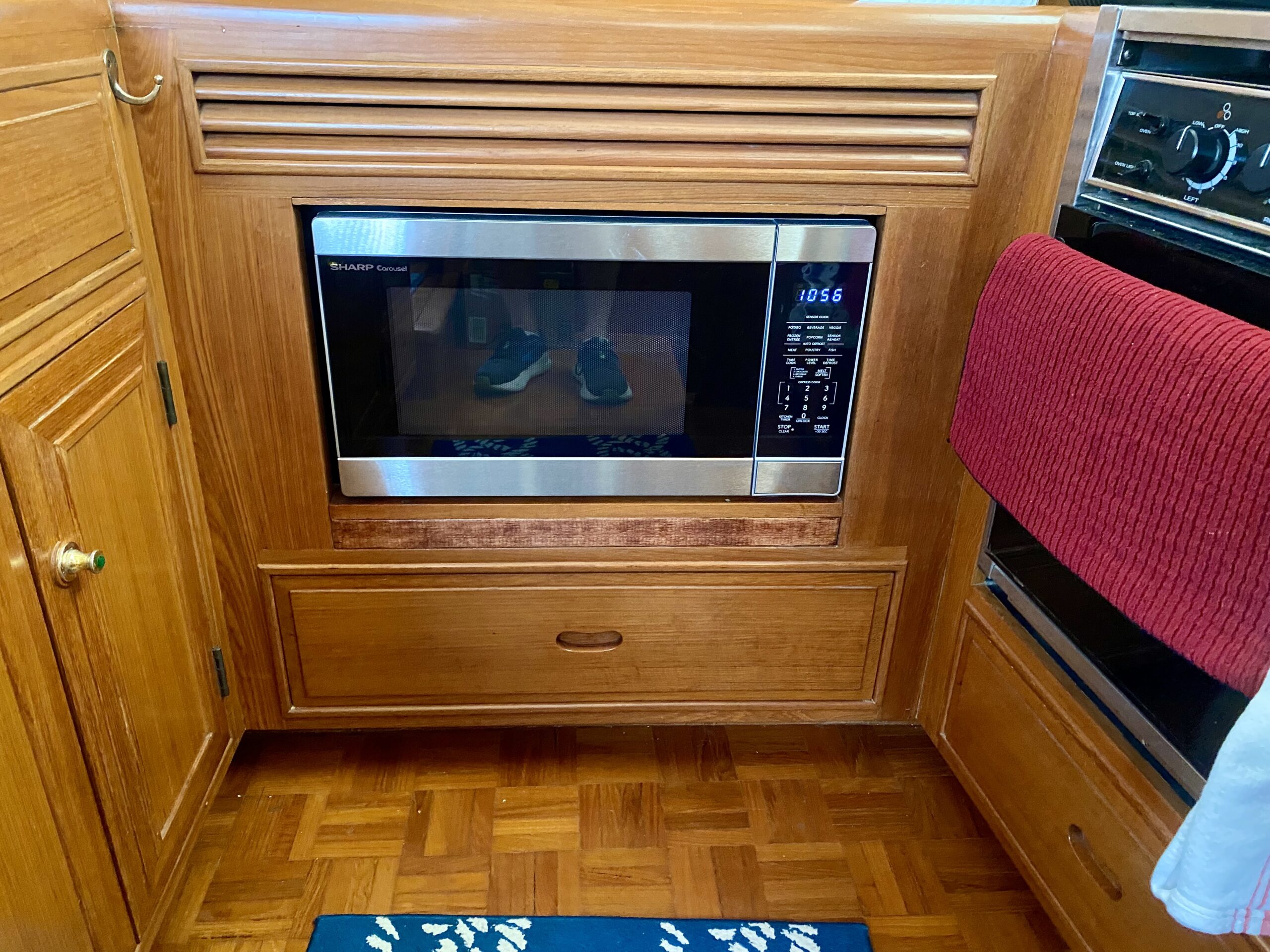 We replaced the microwave in the galley. It was original to the boat and was only 850 watts. Our new 1100-watt microwave is a vast improvement and easier to operate. Not a difficult project.